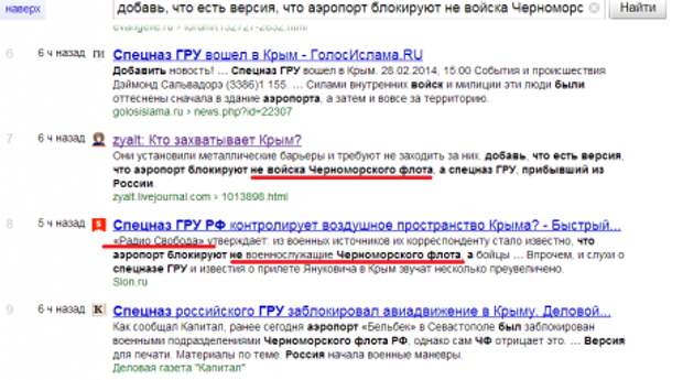 В первоначальной версии Варламов, по своей невнимательности, забыл удалить следующую строчку: "Добавь, что есть версия, что аэропорт блокируют не войска Черноморского флота, а спецназ ГРУ, прибывший из России".