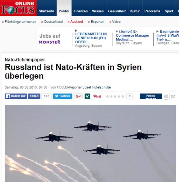 Вполне себе авторитетный немецкий журнал "Фокус" (с самого начала украинского кризиса занимающий 100% антироссийскую позицию) опубликовал, со ссылкой на секретный аналитический доклад НАТО, материал, согласно которому российские ВКС в Сирии превзошли силы альянса.